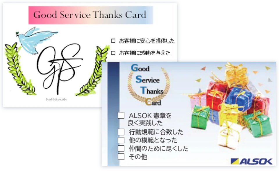 ALSOKでは、部下や同僚が活躍している様子を目にした時や業務上の支援を受けた時、お客様から感謝の言葉をいただいた時などにその内容や感謝の気持ちをカードに記して手渡すGSTカード(GOOD SERVICE THANKS CARD)を導入しています。