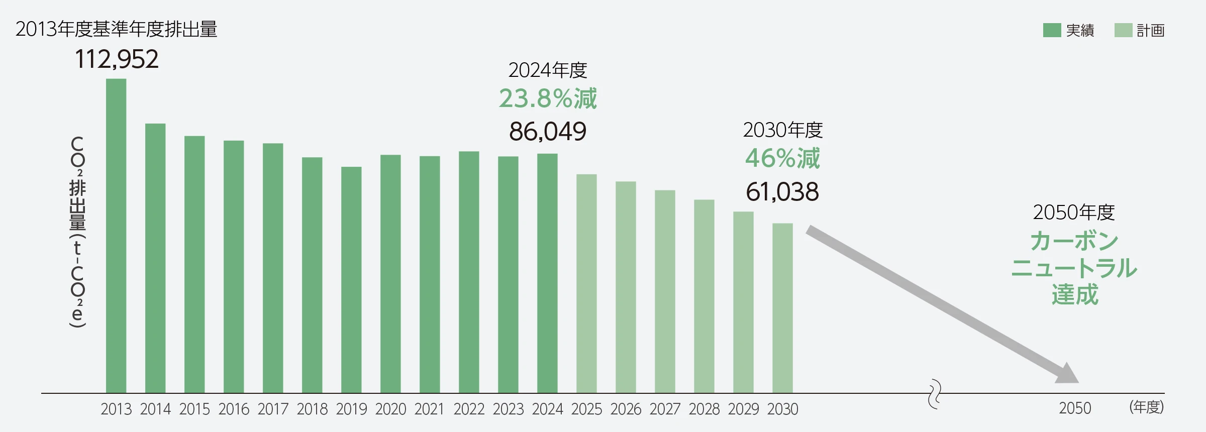 これまで、中期目標「2031年3月期のCO₂排出量を26%削減(2013年度比)」および長期目標「2050年までに80%削減」を掲げてきましたが、政府目標との整合性を図るべくこれらの見直しを行い、2023年に新たな目標を設定しました。