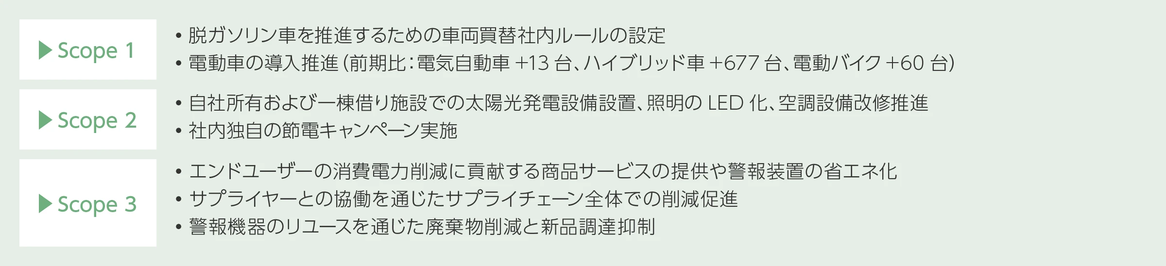 短期目標および中・長期目標の達成に向けて、社内で制定している車両買替基準に基づく環境対応車両(EV、HV)へ買い替えや、自社施設のLED化、導入後10年を経過した空調設備のリニューアル、OA機器の買い替え等を推進してまいります。