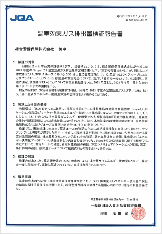 2025年度は「ALSOKグループ全体におけるCO₂排出総量の前年比8.62%削減」および「ALSOKグループ全体におけるCO₂排出量(売上高原単位)の前年比15.2%削減」を目標としています。