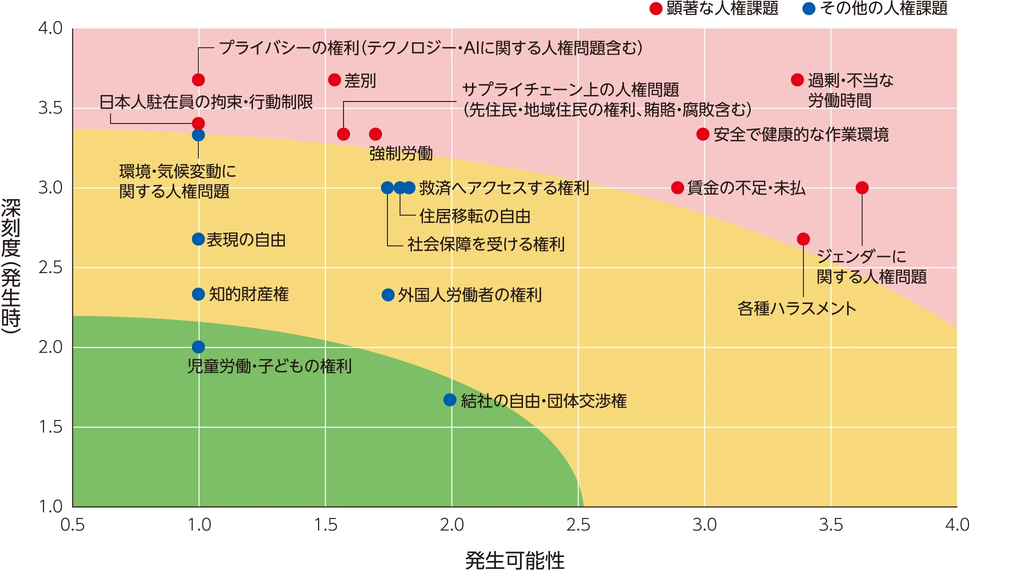 当社の活動や取引によって、人権にどのような影響があるかを「深刻度」と「発生可能性」の両面で点数化し、マッピングすることで、顕著な人権課題を特定しました。
