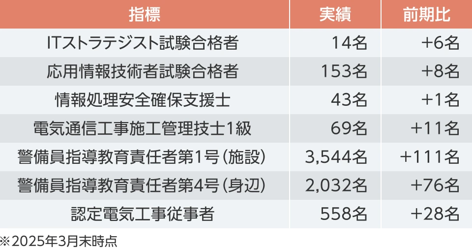 また、ヒトと技術(デジタル)を融合することで、省人化を図りながらも新たな価値創造を実現するべく、現場の社員を含めたすべての社員に対してデジタル教育を実施しデジタルリテラシーの向上を図るとともに、より高度なスキルを有する人財の育成を目的として、専門資格の取得を支援する制度を導入しています。