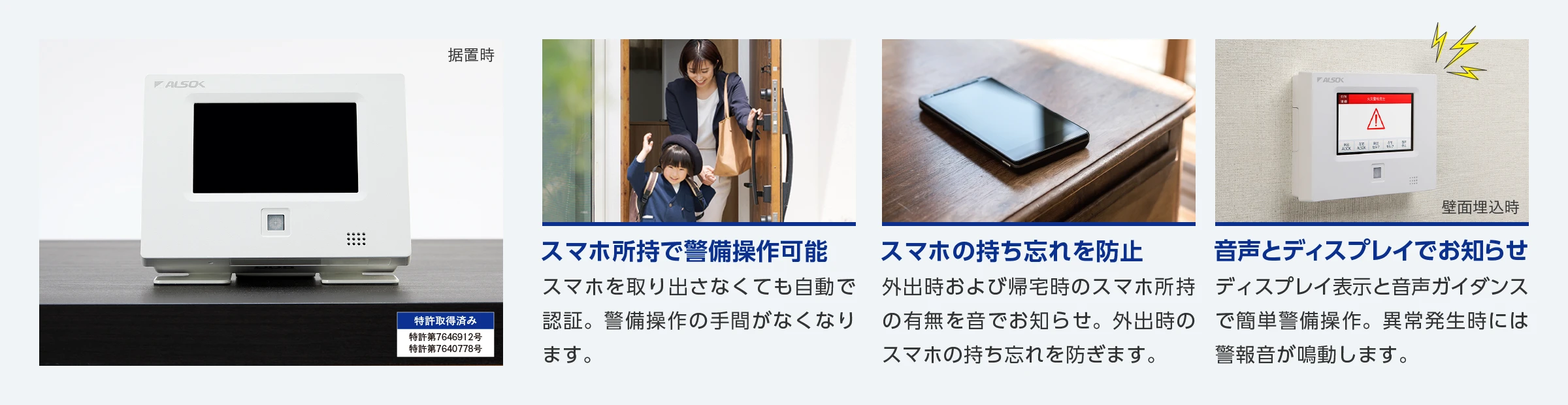 ホームセキュリティ「HOME ALSOK Connect」に、「スマホ認証での警備の開始/解除操作」だけでなく「スマホ忘れ防止機能」を搭載し、利便性を追求したコントローラー「スマホゲート」の提供を2024年5月より開始しました。警備操作の煩雑さを解消するほか、スマホの持ち忘れ防止にも効果的なスマホゲートは、シームレスな警備操作で快適な暮らしをサポートし、お客様に「安全・安心」な毎日をお届けします。