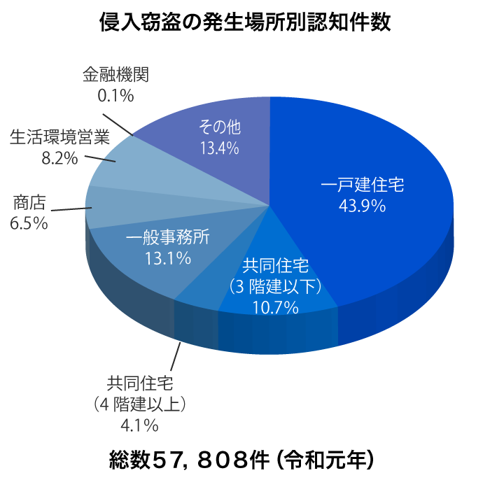 警察庁のデータによれば、侵入窃盗の認知件数は平成15年以降減少傾向にあります。住宅を対象とした侵入窃盗も同じく減少しており、令和4年は15,692件で前年比-9.2%。しかし、未だに一日当たり約43件と多くの住宅が被害を受けています。