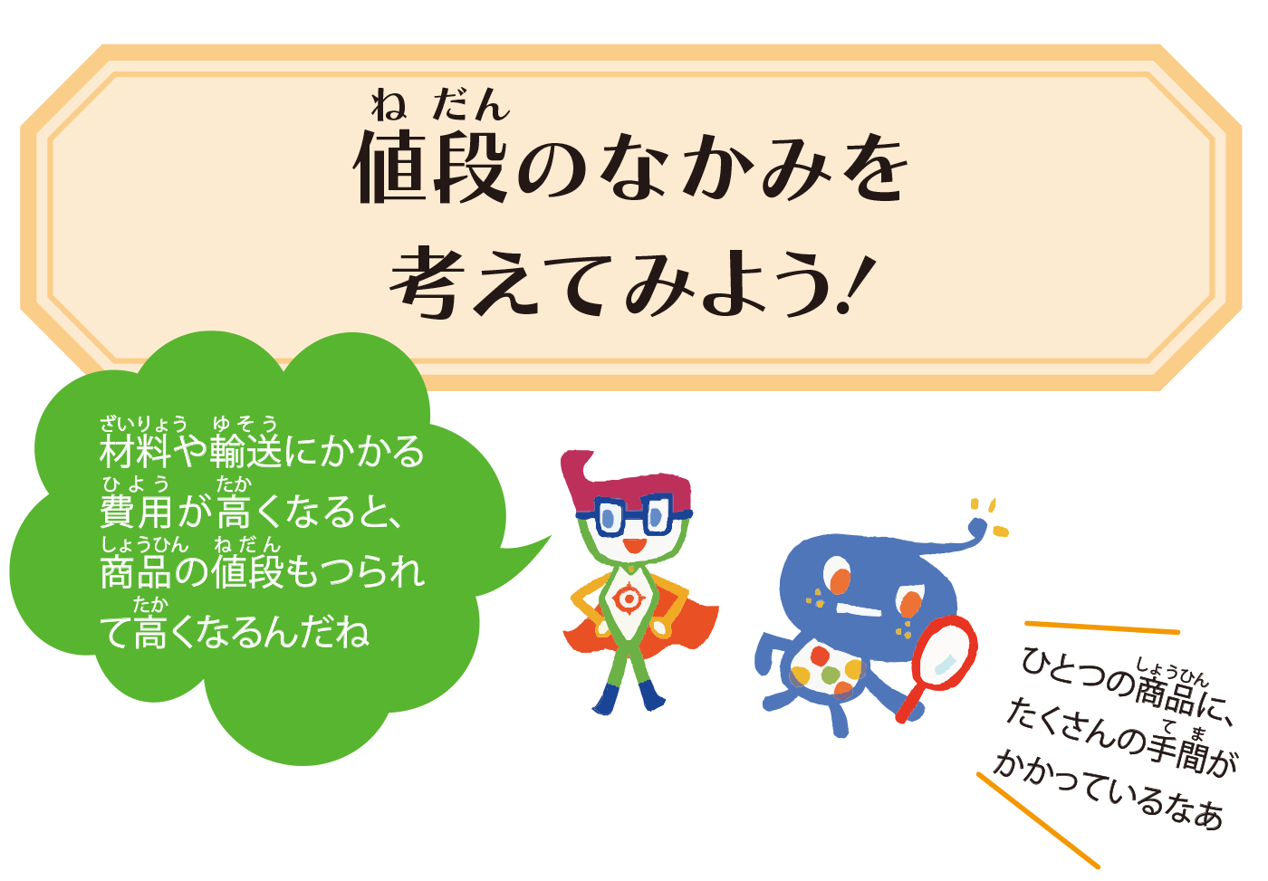 お店に行くと、いろいろな商品に「100円」や「500円」などの値段がついています。この額は、お店の人が勝手に決めているわけではありません。商品をお店に並べるには、材料を用意して加工し、できあがった商品をお店に届ける必要があります。それだけで、材料費、加工費、輸送代などの費用ががかかります。さらに、お店の電気代や働いている人のお給料を払うために、利益をちょっと上乗せして…こうして、ものの値段が決まるのです。さて、あなたが今日買ったものには、どんな「費用」が含まれているでしょうか?