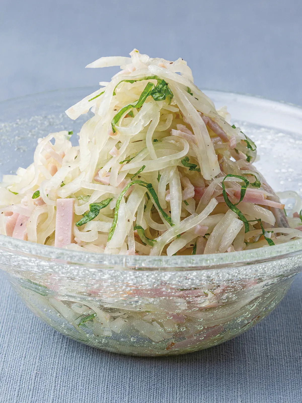大根は細切りにしてボウルに入れ、塩を振ってさっと混ぜ、5分置いて水気を絞る。青じそはせん切りにする。ハムは半分に切って細切りにする。