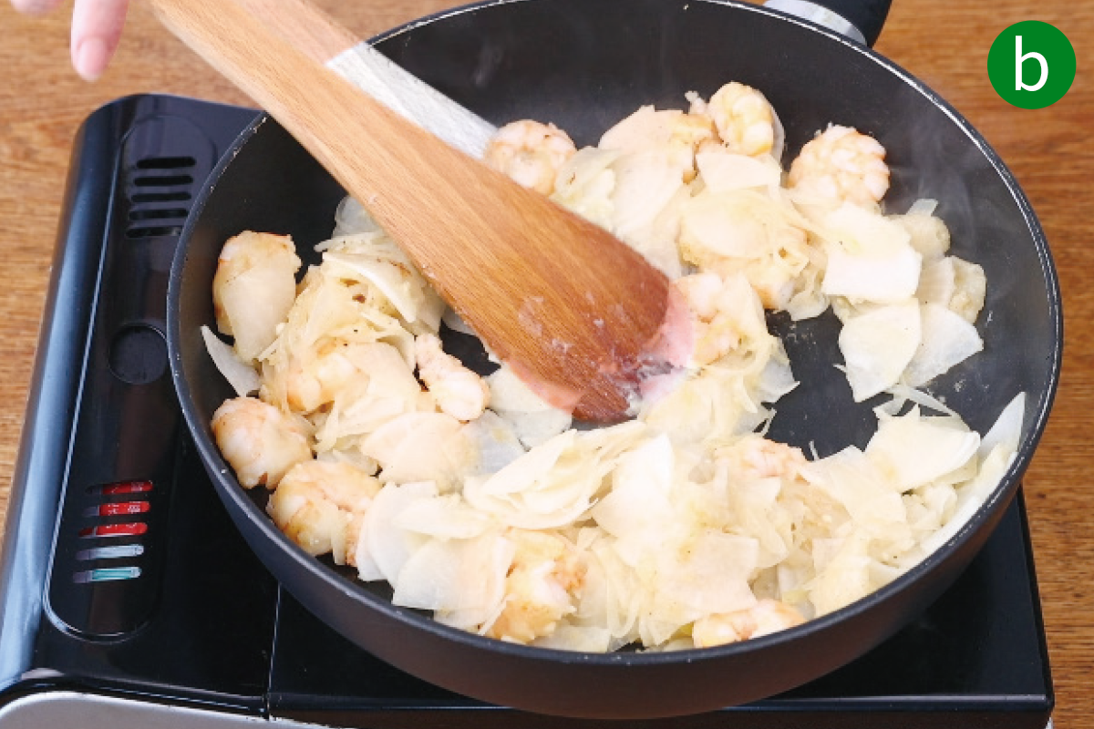a大根は薄くいちょう切りにする。玉ねぎは縦に薄切りにする。えびは背わたを取り、塩少々(分量外)で揉んでからさっと洗い、水気をふく。マカロニは袋の表示通りに茹でて水気を切る。