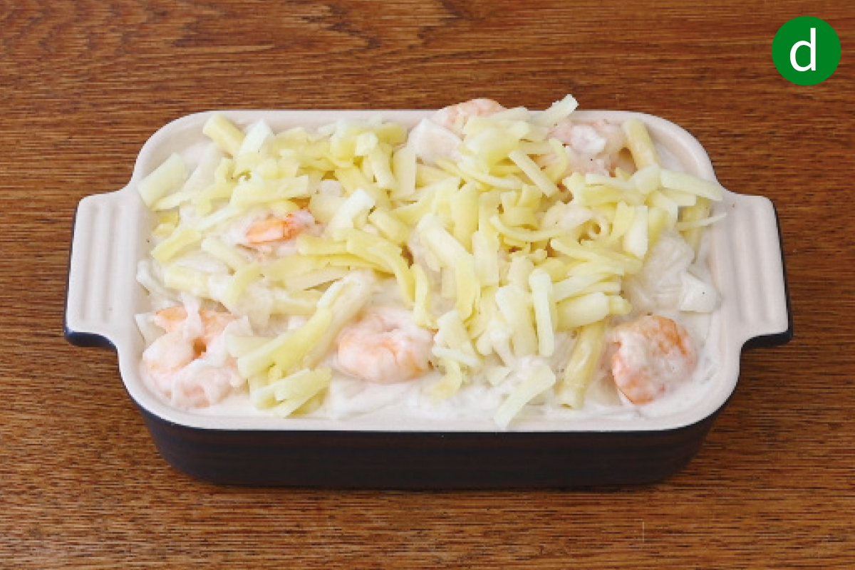 マカロニを加えて混ぜながら1分ほど煮る。d耐熱の器に入れてピザ用チーズをのせ、トースターでこんがり焼き色が付くまで(8分ほど)焼く。